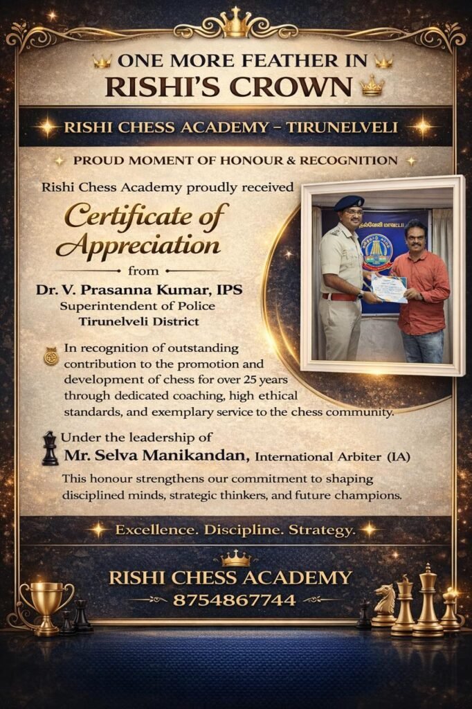Over the years, students of Rishi Chess Academy in Tirunelveli have participated in numerous tournaments and won several accolades. The academy’s structured training and focus on practical gameplay have helped many young players become state-level and national-level chess champions. Consequently, it has earned a reputation as one of the most trusted chess academies in Tirunelveli.