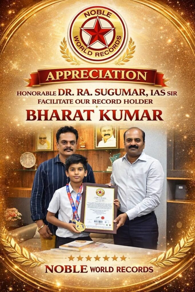 Rishi Chess Academy in Tirunelveli is proud to celebrate remarkable achievements in the world of chess. Recently, the academy had the honor of being recognized for Noble World Records, with our talented student Bharat Kumar receiving special appreciation. The event was graced by Honorable Dr. Ra. Sugumar, IAS Sir, which added great prestige to this milestone.